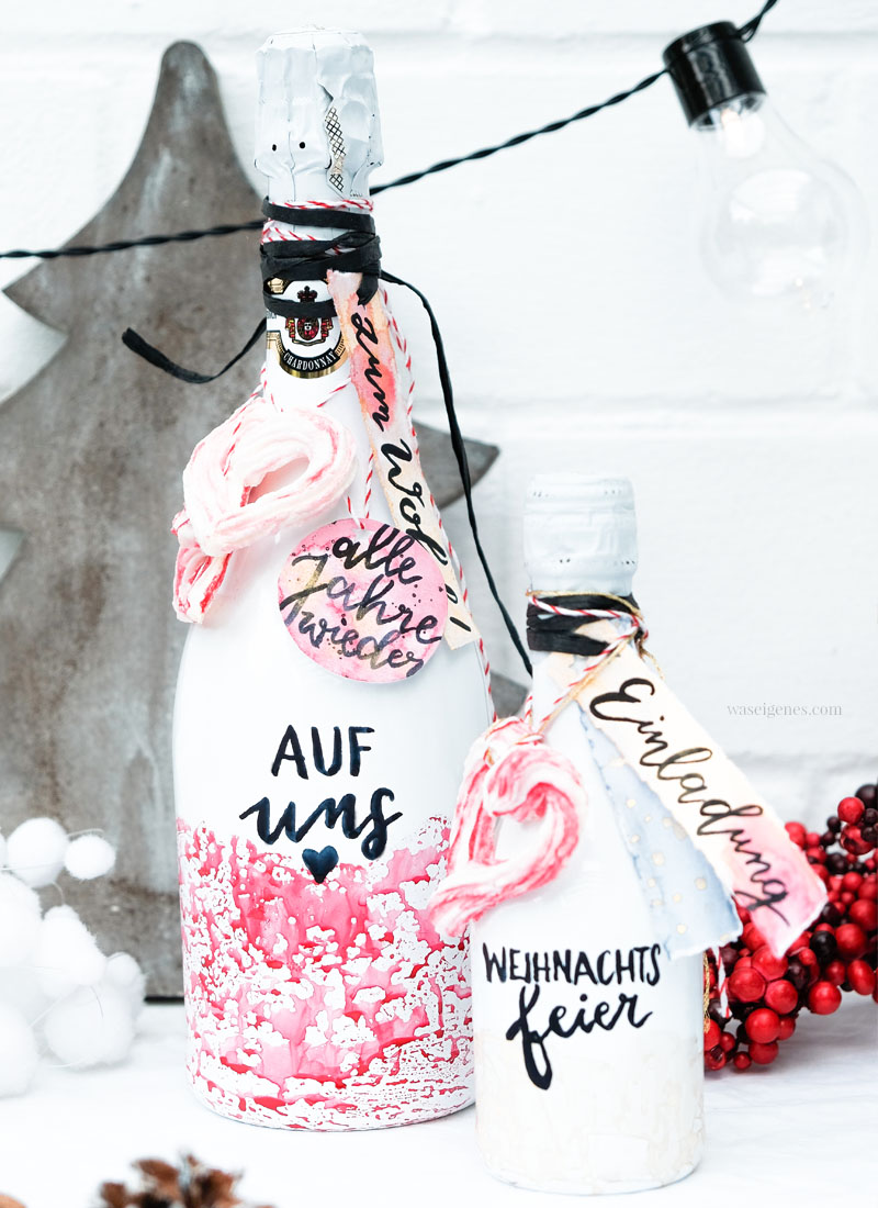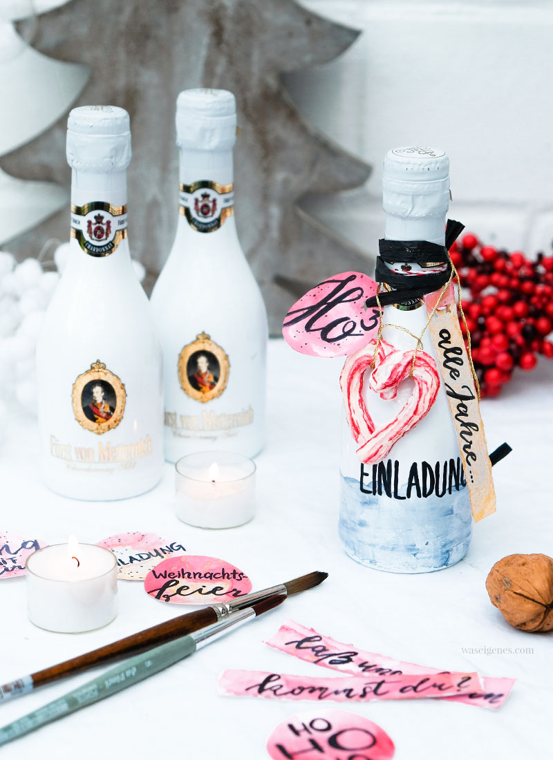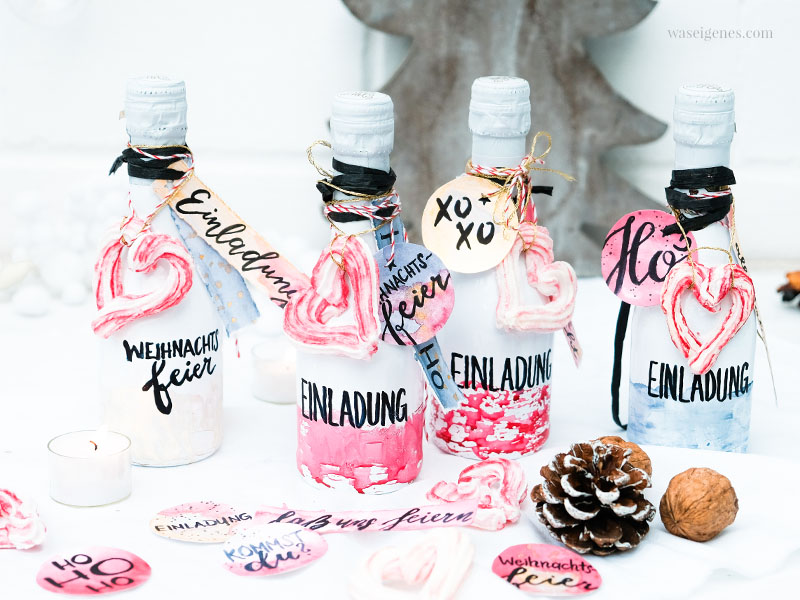 Hin und her habe ich überlegt, was ich mit den kleinen weißen Chardonnay Sektflaschen anstellen könnte. Sie könnten wunderbar als Mitgebsel von Gutscheinen dienen oder auch einfach nur zur Deko mit winterlichen Blumen und Ästen, überlegte ich- aber dann kam mir die Idee die kleinen Flaschen zu einer Flaschenpost Einladung umzufunktionieren. Quasi statt Karten.