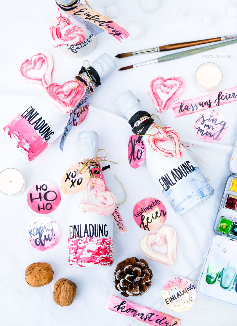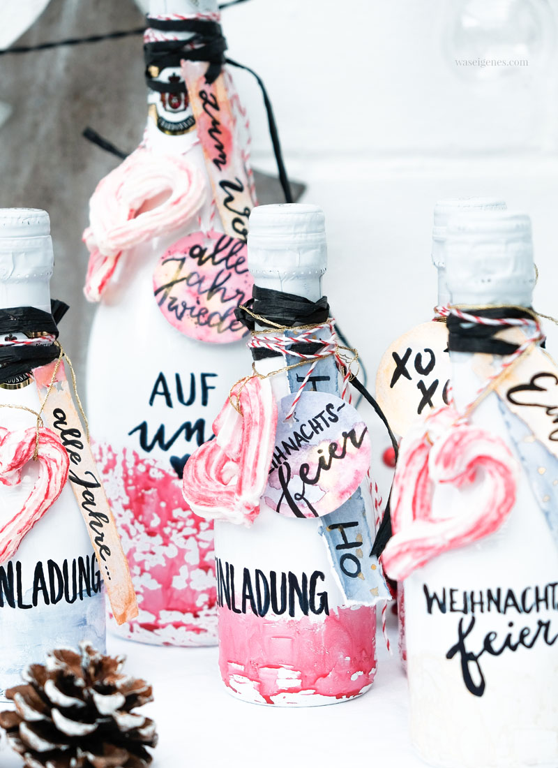 Danach habe ich die Flaschen mit Aquarellfarben bemalt. Alle haben einen farblich abgesetzt unteren Teil bekommen und darüber habe ich “Einladung”, bzw. “Weihnachtsfeier” geschrieben. Natürlich, wie so oft, wenn ich mir was in den Kopf setze, aber nicht weiß, ob es funtioniert, mit einer guten Portion Nervenkitzel.