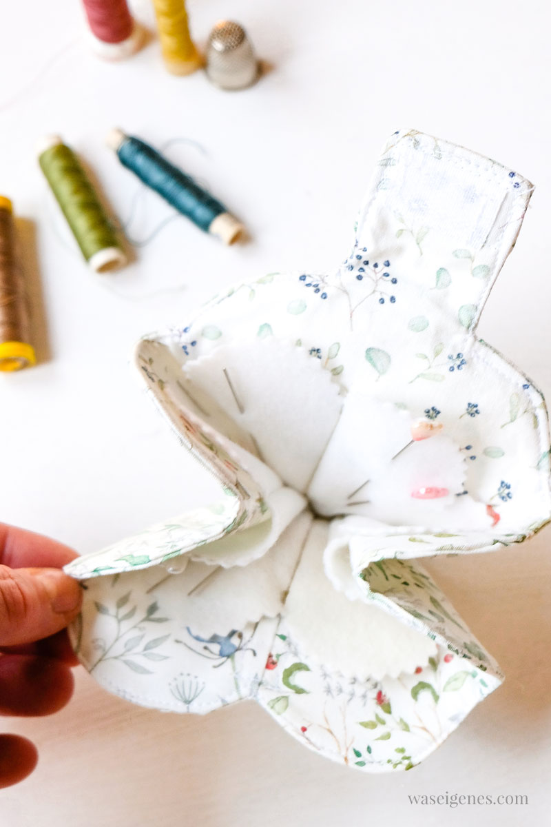 Dort, wo sich die acht Stoffe in der Mitte treffen, sieht es nicht besonders schön und sauber aus. Also habe ich mich entschieden, den gepatchten Teil nach innen zu legen und dort den weißen Bastelfilz für die Nadeln aufzunähen. Jetzt sieht man die unschöne Mitte nicht.