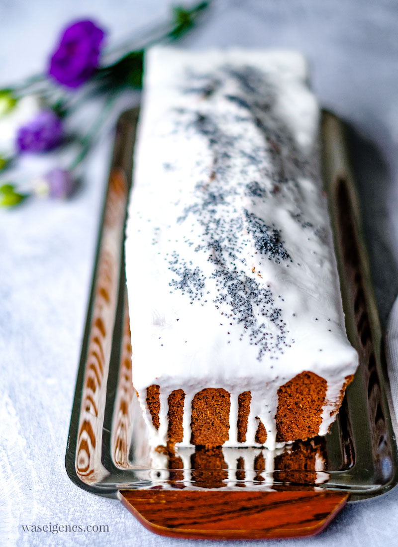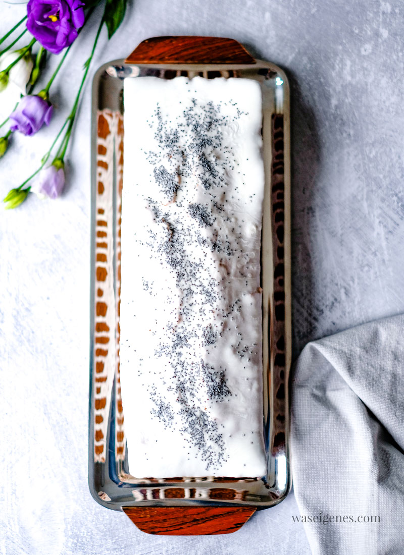Bei der Glasur habe ich diesmal zu einer fertigen Kuchenglasur aus weißer Schokolade {Werbung ohne Auftrag} gegriffen und zum Schluss noch ein wenig gemahlenen Mohn drüber gestreut.