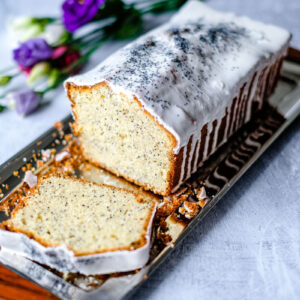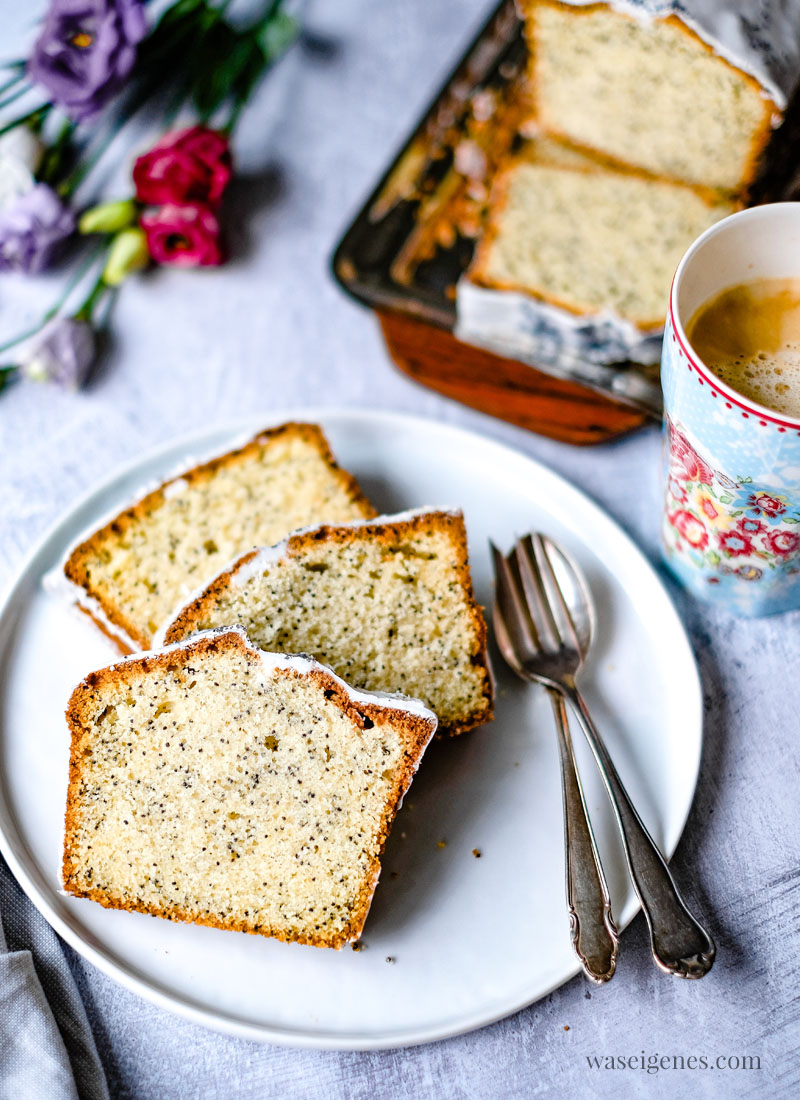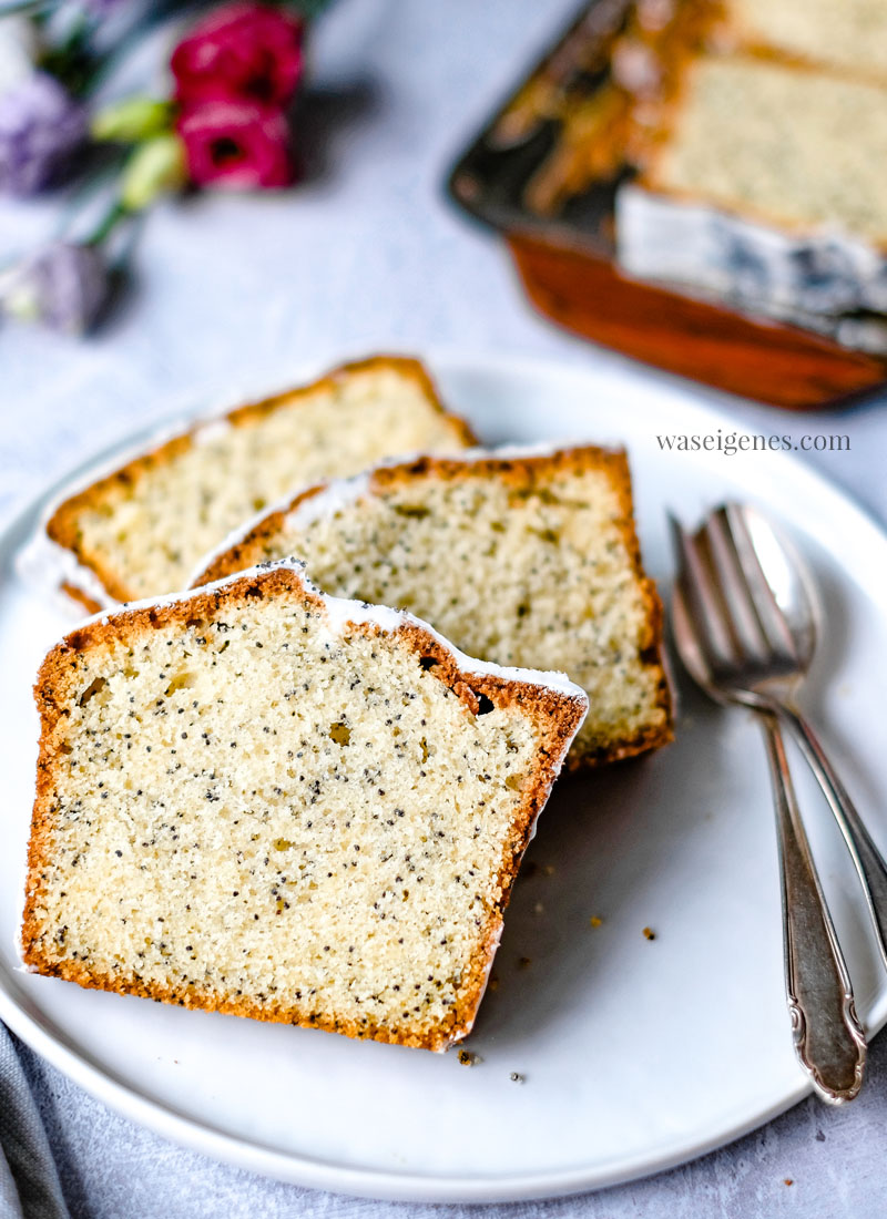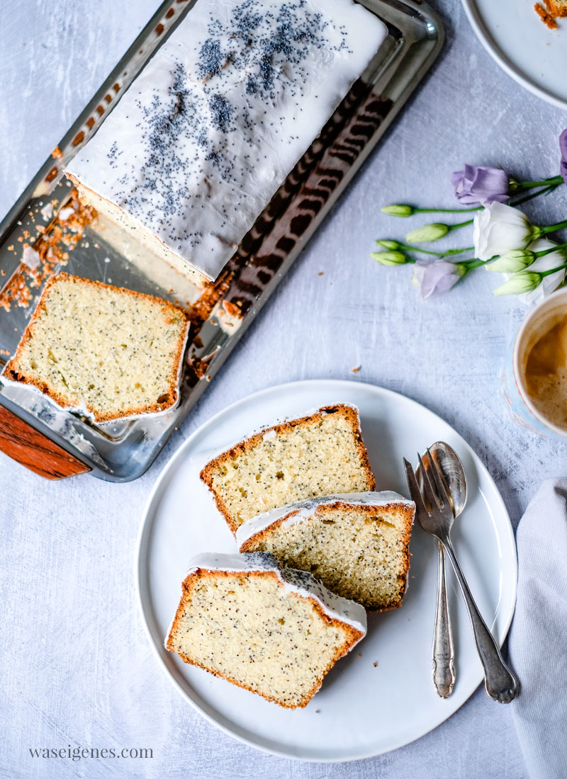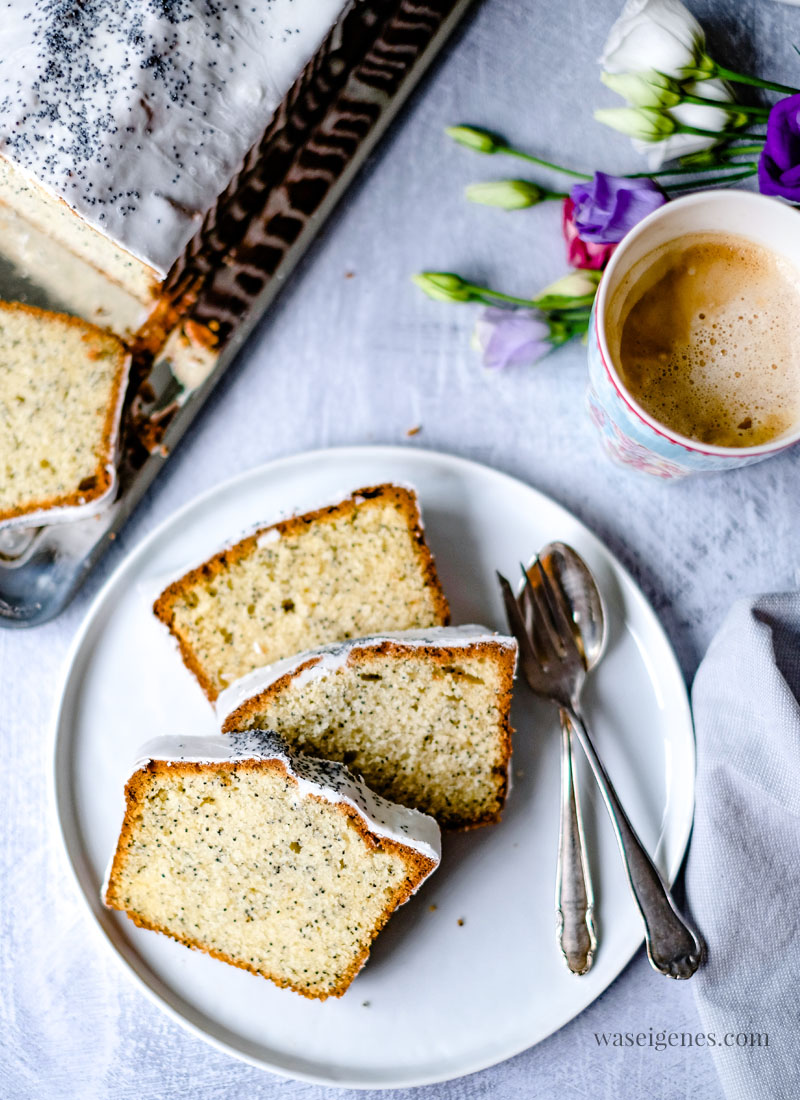 Deinen Kuchen habe ich schon nachgebacken. Mit nur der Hälfte Zucker, dafür aber einem EL mehr Mohn. Und statt einem Guss gibt es bei mir ein bisschen Puderzucker obendrauf.