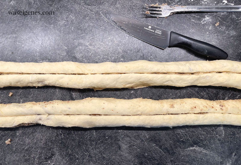 Die Teigplatte nun einmal quer halbieren, also von links nach rechts mittig durchschneiden und dann jeweils die langen Seiten aufrollen. Diese beiden Rollen dann einmal quer einritzen. Nicht durchschneiden!