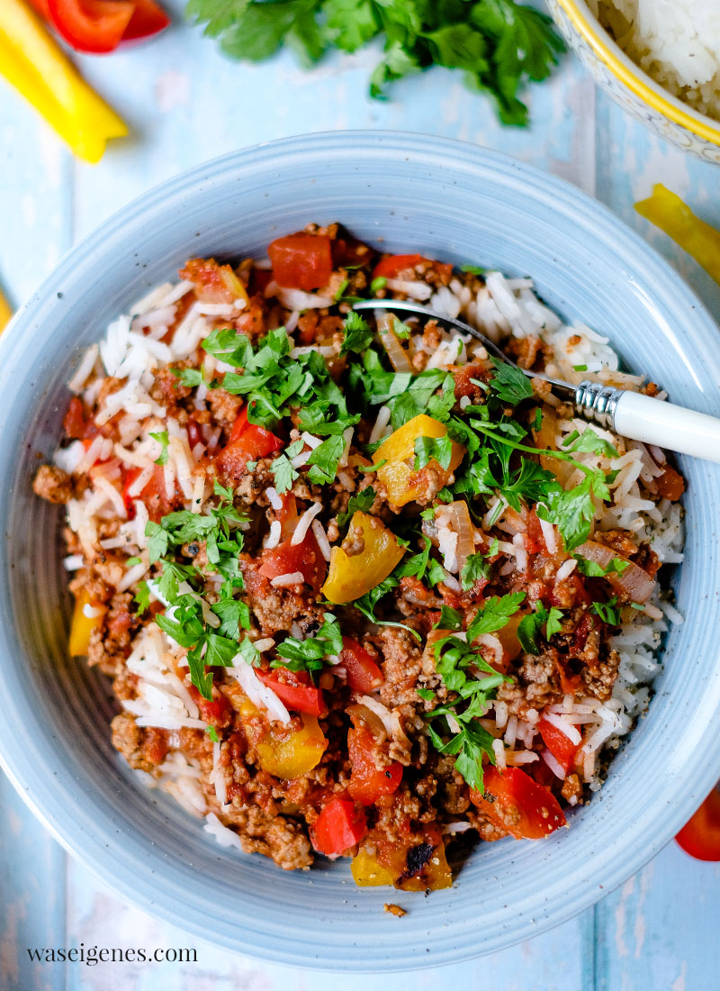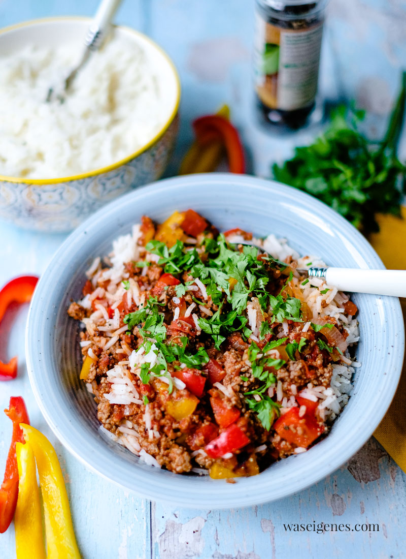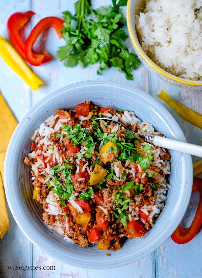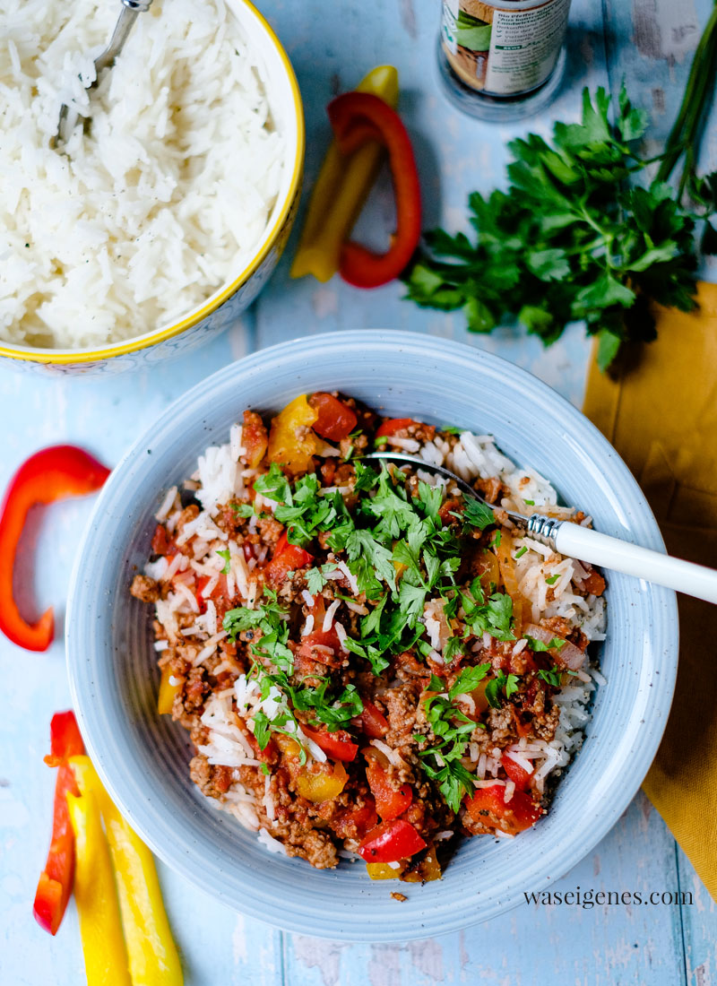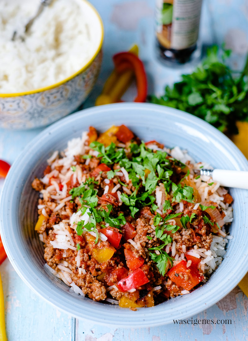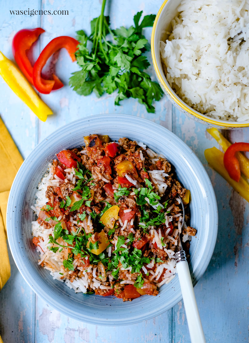 In einer großen Pfanne habe ich das Hack – ob Ihr gemischtes Hack oder Rinderhack anbratet, das ist Eure Entscheidung – angebraten, dann Paprikawürfel und Zwiebelringe hinzugefügt und alles zusammen mit passierten Tomaten und einem Schuss Balsamico abgelöscht. Währenddessen blubberte schon der Basmati Reis im Kochtopf daneben. In rund 15 Minuten steht dieses schnelle und einfache Gericht also auf dem Tisch.