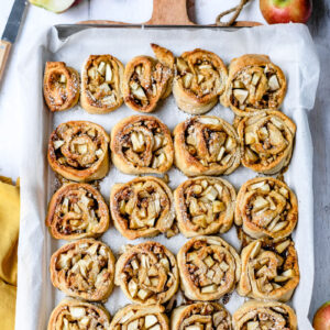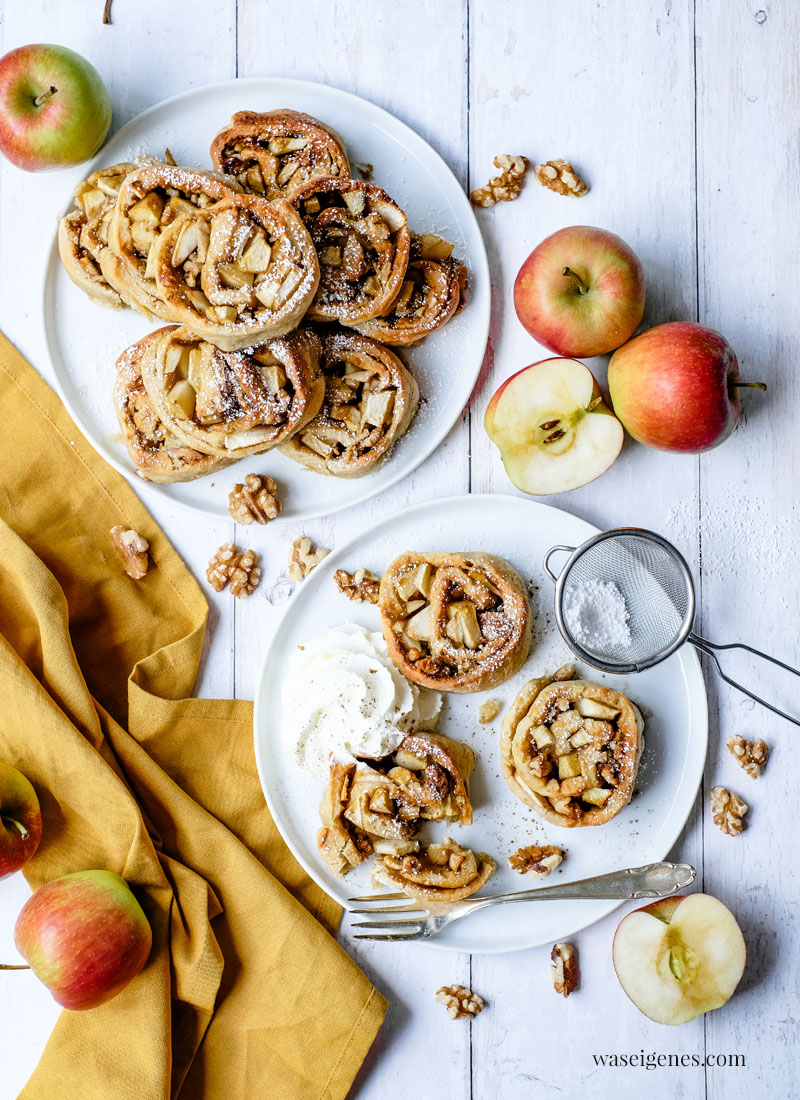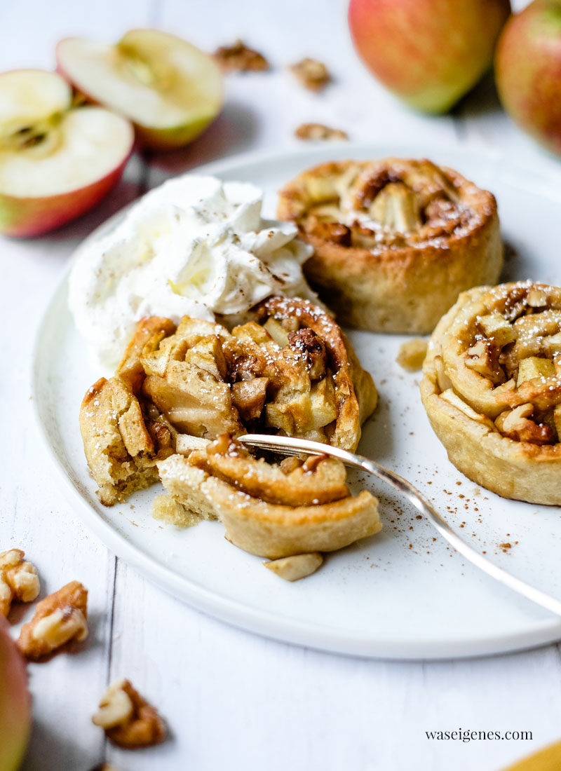 Wie wäre es denn heute mit leckeren Apfel-Joghurt-Schnecken? Also ich würde da nicht nein sagen. Als ich diese Schnecken letzte Woche gebacken und dann meiner Familie vorgesetzt habe, waren sie erstmal skeptisch. Sie dachten nämlich, dass ich Hefeschnecken gebacken habe und erwarteten fluffigere Teilchen. Sorry, nein, diese Schnecken hier sind eher knusprig, apfelig, nussig, aber auch saftig. Alle drei probierten und bescheinigten mir: Lecker.