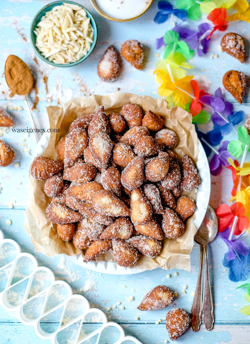 Als ich mir neulich ein Tütchen Mutzenmandeln beim Bäcker kaufte, dachte ich mir: Kann ich auch selber machen und eine gute Woche später stand ich am Herd und schöpfte knusprige Mutzenmandeln aus einem großen Topf mit heißem Fett. Das macht jetzt nicht so viel Spaß, weil so ein Fettgebäck auch immer eine große Sauerei bedeutet und man sich schnell die Pfoten verbrennt… aber das war es mir wert. Und die kleine Brandblase am Ringfinger, die ist schon fast verheilt.
