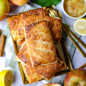 Knusprig und süß – so schmecken diese köstlichen Apfeltaschen, mit denen Ihr bei Groß und Klein punkten werdet. Meine Apfeltaschen sind schnell gemacht, denn ich nutze Blätterteig aus dem Kühlregal im Supermarkt. Das Apfelmus könnt Ihr ganz einfach selbst kochen – aus süß-sauren Äpfeln, etwas Zucker und Zitronensaft und einer Prise Zimt- oder ebenfalls kaufen. Hier duftete es letztes Wochenende verführerisch nach Apfeltaschen! Vielleicht möchtet Ihr das auch? :-)