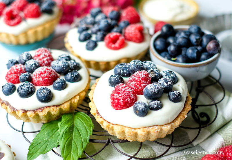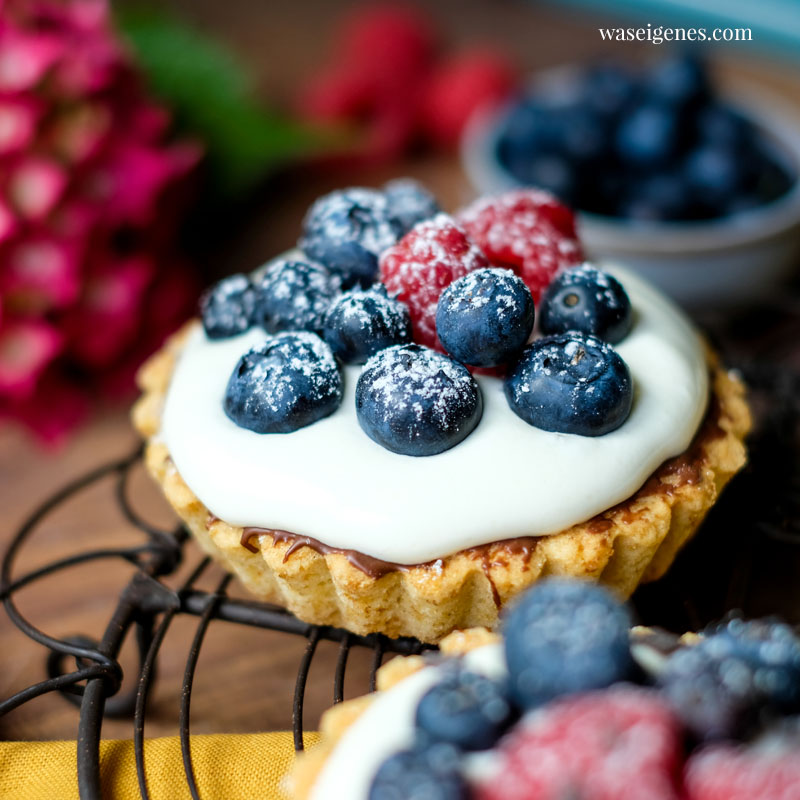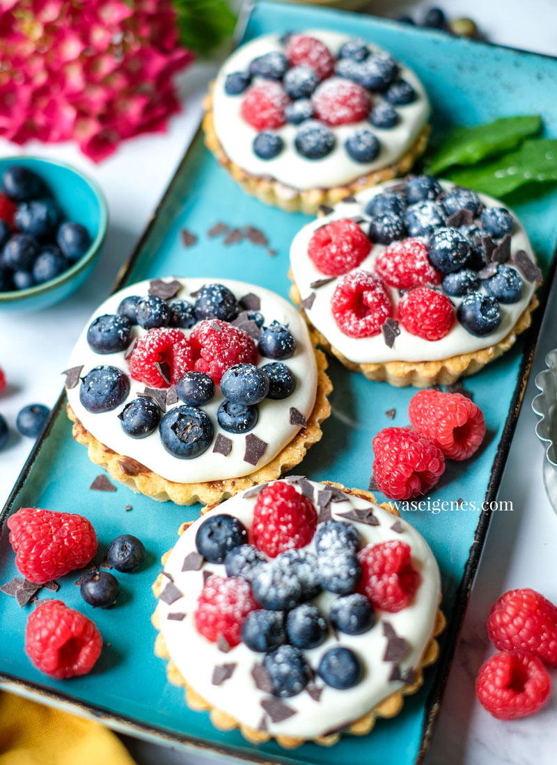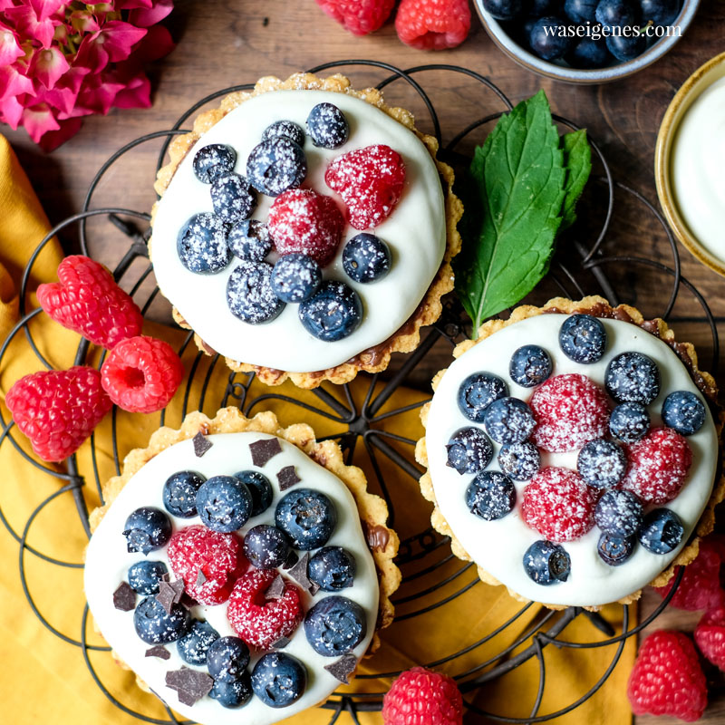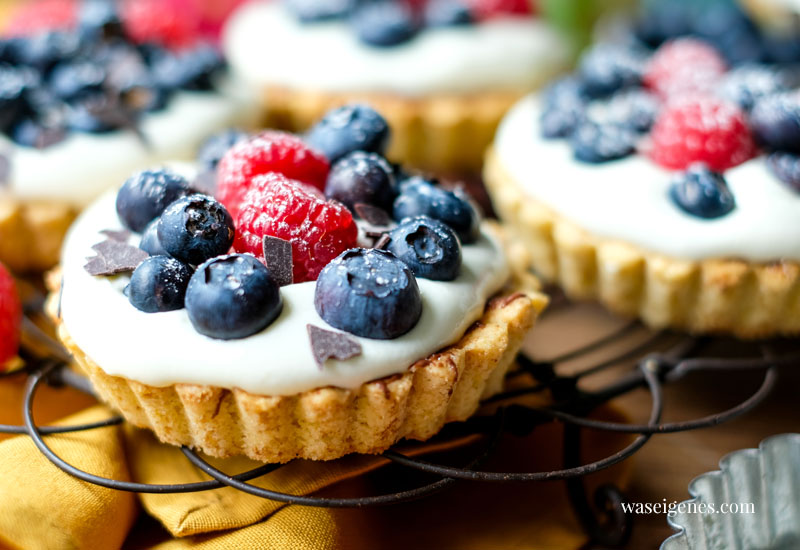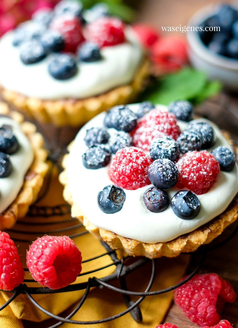 Beerentörtchen ~ Kleine Mürbeteig Tartelettes mit Sahne-Frischkäse-Creme, Himbeeren und Blaubeeren!