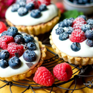 Kleine Mürbeteig Tartelettes mit Sahne-Frischkäse-Creme, Himbeeren und Blaubeeren