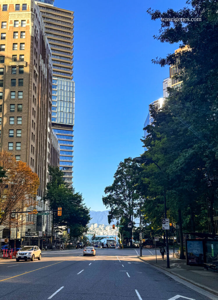 Je nachdem von wo man kommt, bzw. in welche Richtung man geht, sieht man am Horizont die Berge, North Van, das Wasser.