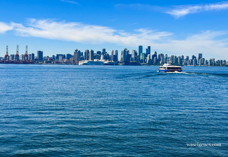 Hier seht Ihr den Blick von der Fähre aus auf die Skyline von Vancouver. Da kamen wir gerade von North Vancouver zurück.