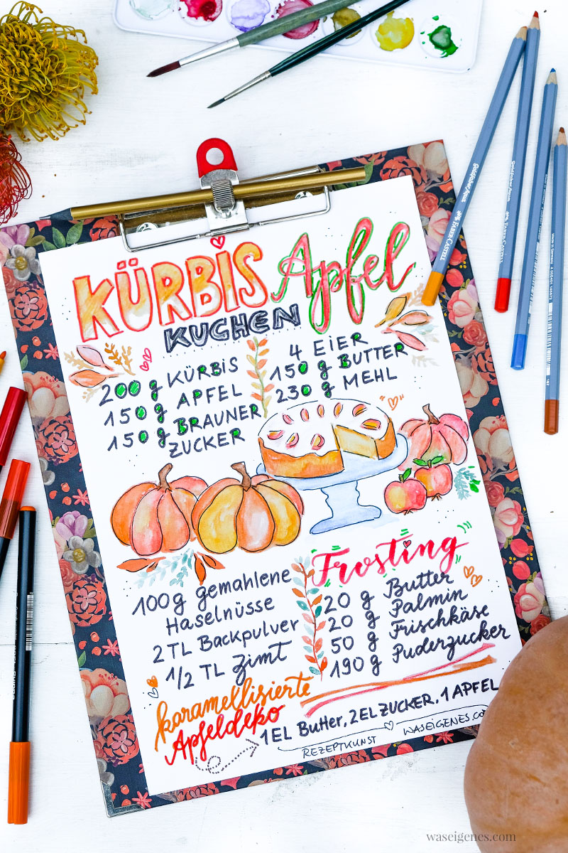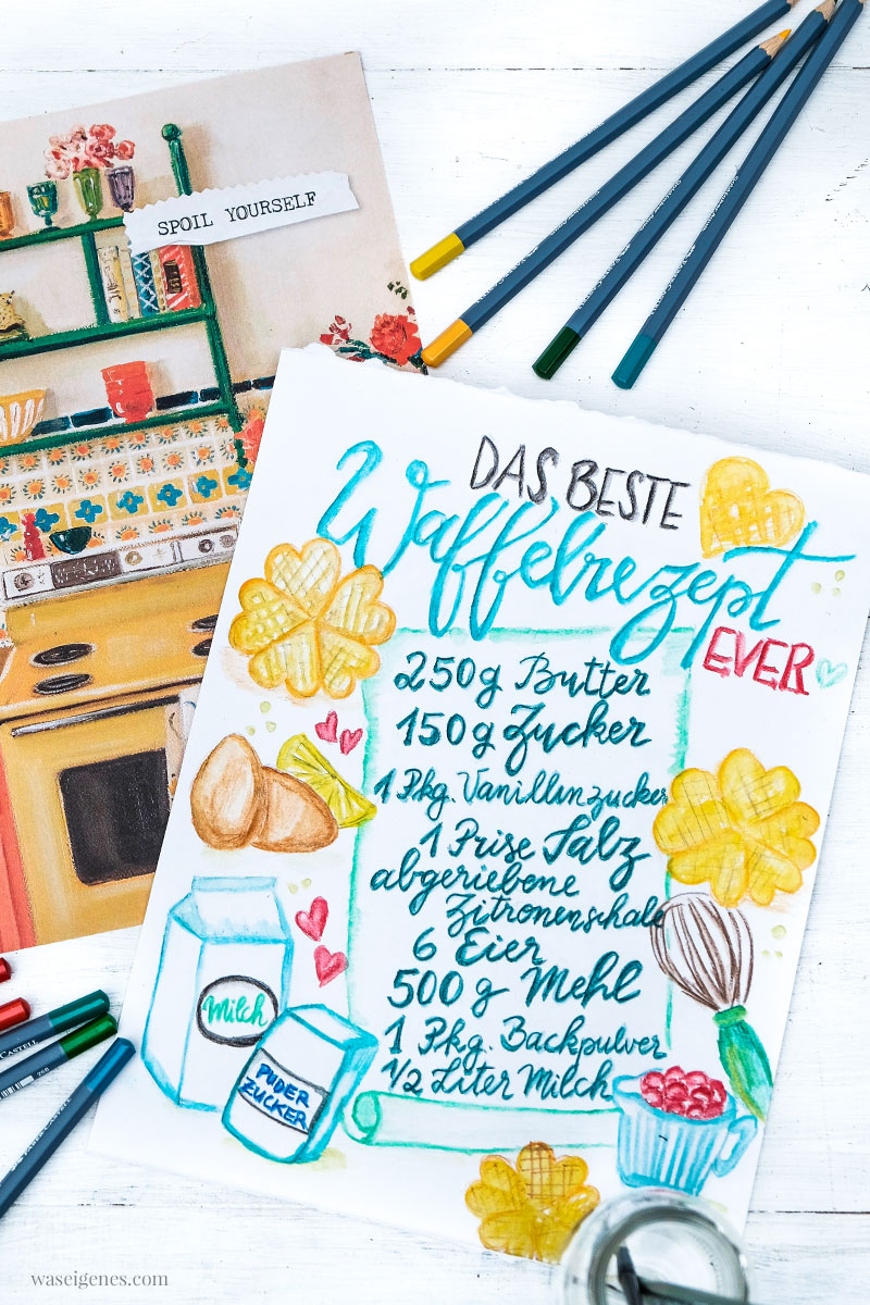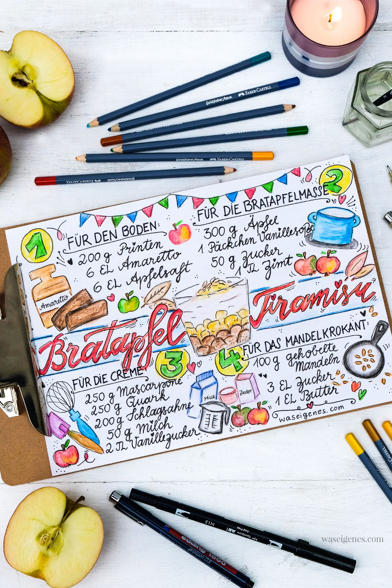 Am liebsten male ich meine Rezepte mit den Goldfaber Aqua Stiften von Faber Castell* und aquarelliere sie danach mit einem Pinsel und Wasser.