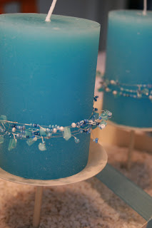 Die vier Kerzen habe ich mit Draht und kleinen Perlen in verschiedenen Blau- und Weisstönen aufgehübscht.