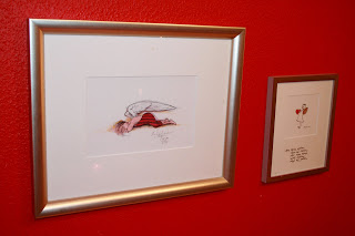 Wohnzimmer. An der roten Wand zwei Engel. Ein ziemlich müder Engel und ein Engel mit Spruch “Man kann geben ohne zu lieben, aber man kann nicht lieben ohne zu geben.”.