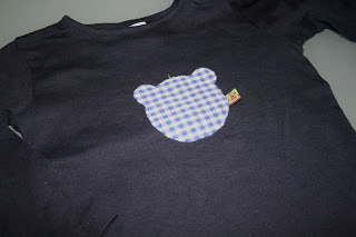Dunkelblaues Shirt mit Teddy-Appli aus blauem Vichy Stoff und kleinem Zwerg.