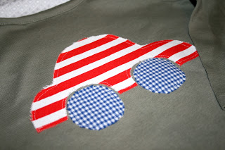 und khaki Shirt mit Auto-Appli aus rot-weiss-gestreiften und blauem Vichy-Stoff für Sohnemann