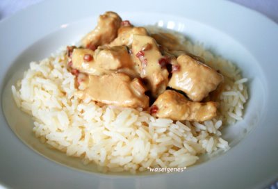 Sieht ja toll aus und ich bekomme gleich Hunger. Bei uns gibts heute auch Reis und Huhn, aber ganz anders zubereitet. Toll, dass man Lebensmittel auf so viele unterschiedliche Arten zubereiten kann. Bis jetzt habe ich noch nicht gewusst, dass es ein Tütchen für Zürcher Geschnetzeltes gibt.