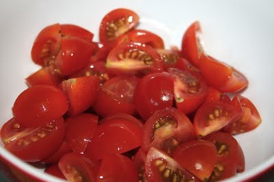 Cherry Tomaten waschen, vierteln, ebenfalls in die Schüssel und auf den Tisch.