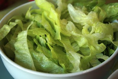 Eisbergsalat waschen, in Streifen schneiden, ab in die Schüssel und auf den Tisch.