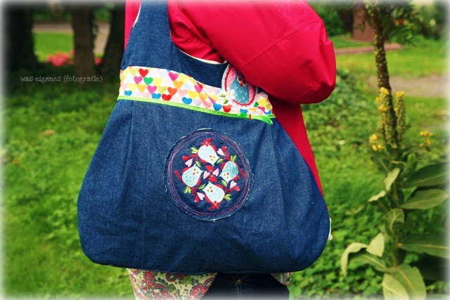 Also musste gleich eine zweite her. Diesmal aus Jeans- & Herzchenstoff mit Eulen-Stickereien. Und ohne Boden…also extra Boden…sondern einfach nur zugenäht. Am besten an dieser Tasche finde ich die genialen Henkel. Wirklich tricky ;-)