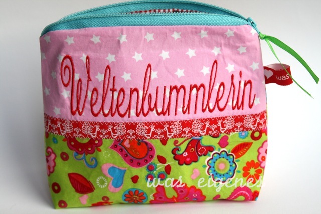 Kürzlich erhiet ich den Auftrag, ein Schminktäschchen mit ‘Fernweh’ zu sticken & zu nähen. Dabei ist mir dann noch diese Variante eingefallen- Weltenbummlerin: