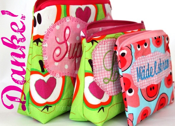 Ich habe für Euch genäht und möchte diese drei ‘was eigenes’ Täschchen an drei Leser ver(losen)schenken:
