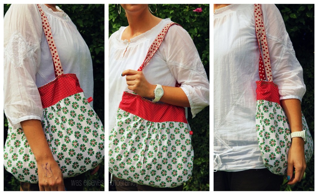 Jetzt habe ich es endlich gewagt und aus dem niedlichen Kleeblattstöffchen eine (meine erste!) Gretelies genäht. Ohne Schnickschnack, nur mit rotem Pünktchenstoff kombiniert. Und, es tat gar nicht weh… ganz im Gegenteil! Ich habe mich sehr in meine neue Tasche verliebt und freue mich, dass ich dieses alte Stoffschätzchen jetzt immer mit mir rumtragen kann!