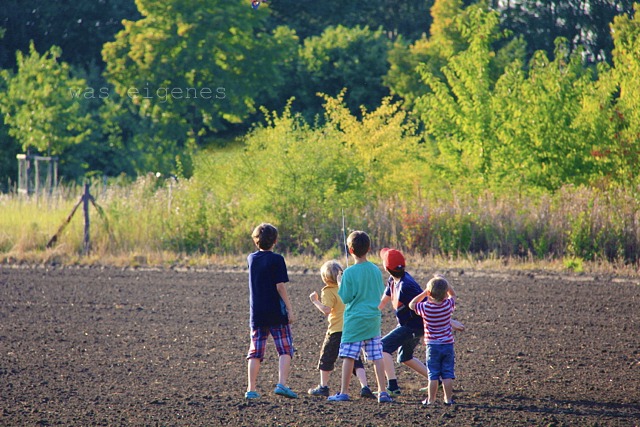 Am vergangen Samstag, das Wetter war einfach grandios, standen vier “große Jungs” vor der Tür und fragten, ob der Mini-Hoppi auch auf’s Feld dürfe. Sie wollen einen Flieger steigen lassen und würden auch ganz bestimmt auf den Mini-Hoppi aufpassen. “Niedlich!” dachte ich mir, denn sonst hält sich die Spiellust der Großen mit den Kleinen doch eher in Grenzen. Verständlicherweise. Ich ließ ihn laufen….