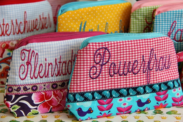 Wir wäre es mit einem Kosmetik- oder Schminktäschchen, bestickt mit Mädchenkram, Privatsache, Luxuskram, Lästerschwester, …