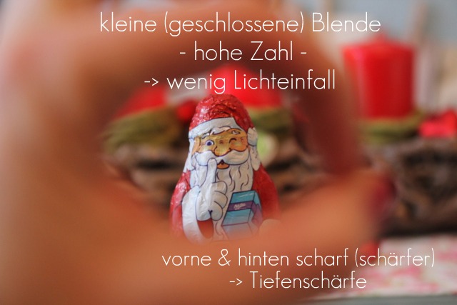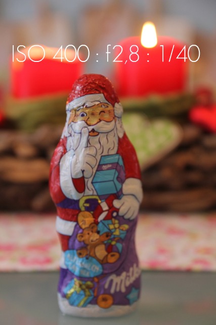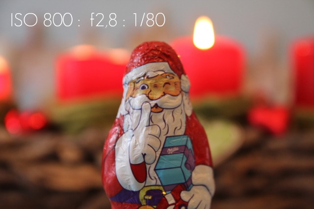 Ist die Blende weit geöffnet (kleine Zahl, hier f2,8) ist der Schärfegrad des Bildes eher gering, das bedeutet: ein Punkt (meist der Vordergrund) im Bild ist scharf, der Rest (Hintergrund) verschwommen. Hier sind die Kerzen beinahe völlig verschwommen: