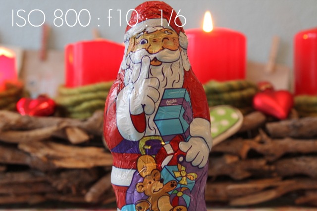 Ist die Blende eher geschlossen (hohe Zahl, wie hier f10), erreicht man, dass nicht nur der vordere Teil des Bildes scharf ist, sondern auch der Hintergrund schärfer wird, man also eine höhere Tiefenschärfe erzielt. Hier könnt Ihr die Kerzen viel besser erkennen: