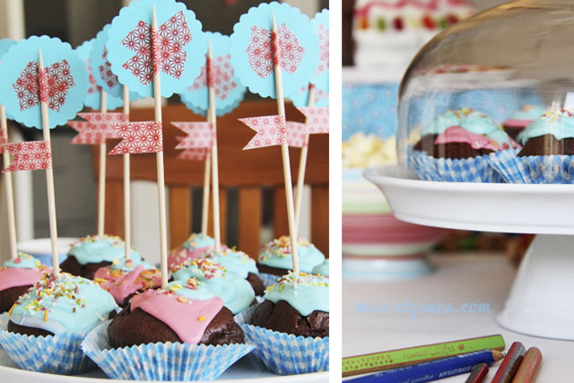 ach sind die kleinen cupcakes so süß verziert… ich bewundere das immer wie viele hier die kindergeburtstage so wunderschön feiern.. die dekoration ist einfach zucker :))