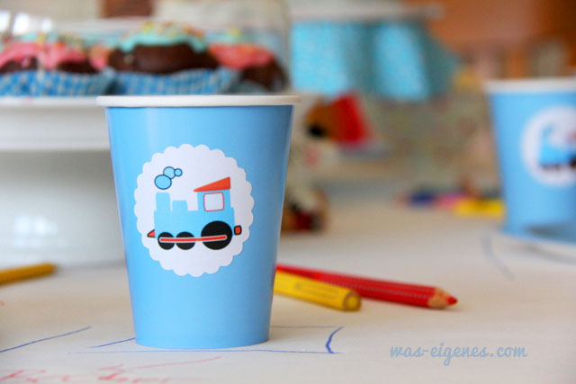 Ich habe jedoch die bereits gezeichnete Einladungslok verkleinert, auf DIN-4-Papier ausgedruckt, dieses auf weißem Fotokarton geklebt und mit einem runden Stanzer ausgestanzt. Daraus habe ich zum einen Cake-Topper gebastelt (einfach die Loks mit Washi Tape an Schaschlik-Stäbchen kleben) und habe damit die blauen Pappbecher aufgehübscht. Die Tischdecke durfte diesmal bemalt werden, was insbesondere von den Mädchen auch gerne getan wurde.