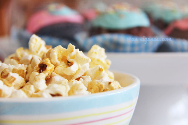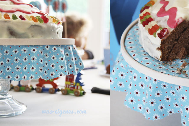 Die schnöde Glas-Kuchenplatte habe ich mit einen Stück hübschen Blümchenstoff und einem Stickrahmen (den ich mit Sprühfarbe weiss gemacht habe) aufgehübscht und zum Gummibärchen-Kuchen gab es natürlich Popcorn.