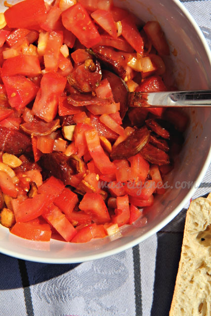 Ich überlege noch, wie ich den besten Tomatensalat ever in vegetarisch abwandeln soll – ob wohl gegrillter Tofu als Chorizo durch geht?