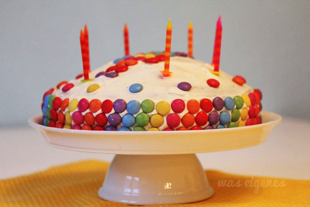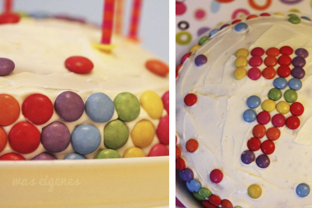Ich habe einen simplen Marmokuchen in einer Springform gebacken. Nachdem der Kuchen gut abgekühlt war, habe ich ihn mit weißem Frosting eingepackt und anschließen die Smarties in Regenbogenfarben an den Rand ins Frosting gedrückt. Natürlich durfte die obligatorische Zahl nicht fehlen :-)