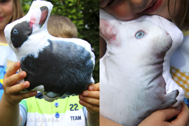 Schon wieder Kissen! :-) Ihr könnt Euch sicherlich denken, dass Zorro und Schnuppi hier täglicher Kuschel- und Streichelattacken ausgesetzt sind!? Damit die Kinder ihre Häschchen jetzt überall mit hin nehmen können, vorzugsweise ins Bett, habe ich ihnen je ein Fotokissen genäht!