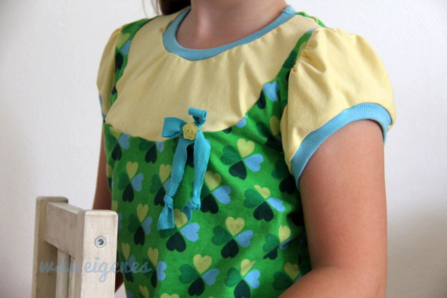 Hier das Ergebnis von grüner Klee trifft gelb trifft Lina und ich finde dieses Treffen großartig und die Besitzerin ebenso. Aufgehübscht habe ich das Shirt mit einem kleinen Streifen Jersey, den ich zu einer Schleife gelegt und mit einem Knopf fixiert habe. Diese Idee habe ich in der Klick & Blick Galerie gesehen. Kennt Ihr Klick & Blick? Wenn nicht, dann schaut dort auf jeden Fall mal vorbei. Die Galerie ist perfekt, um sich Inspirationen, Stoff- bzw Jersey-Zusammenstellungen und Ideen zu Accessoires an Kleidung zu holen!