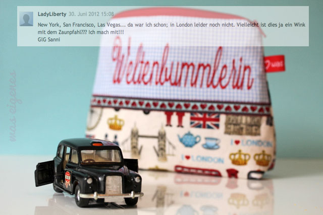 Der Wink mit dem Zaunpfahl geht an Sanni/ LadyLiberty (ohne Blog), die das Weltenbummlerin-Täschchen ihr eigen nennen darf: