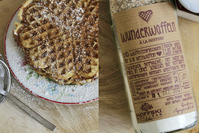 Himmlisch, köstlich, mal was anderes: Wunderwaffeln! Mit Puderzucker und einen Klecks Glücksbringer… Kirschcreme mit Schokolade. Wunderbarst, wenn man so eine leckere Mischung geschenkt bekommt, denn für einen selbst kauft man sowas doch nicht, oder? Seit Ende August stand die Mischung nun schon hierum. Neulich kam sie zum Einsatz, denn Waffeln esse ich am liebsten an kalten Tagen (wobei, im Sommer mit Vanilleeis und Beeren, würde ich sie auch nicht verschmähen!).