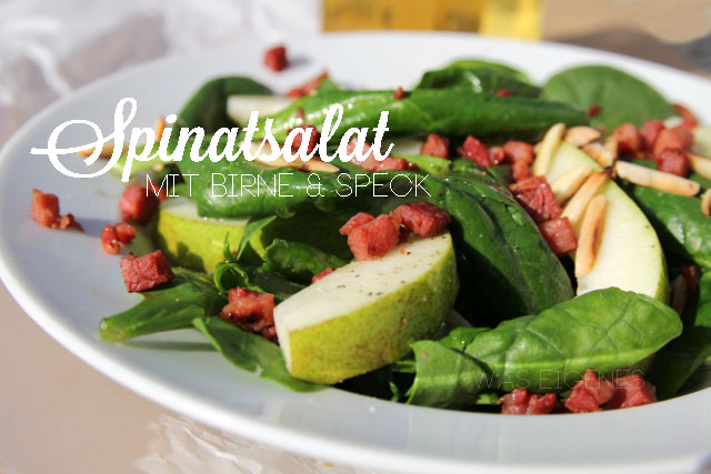 Man nehme: frischen Blattspinat (aus dem hauseigenen Gemüsegarten und wenn der nicht vorhanden ist, vom Bauern um die Ecke und wenn es den auch nicht gibt, dann eben aus dem Supermarkt!), ein- zwei Birnen, Speckwürfelchen, und ein paar Mandelnstifte. Speck und Mandeln werden in der Pfanne kurz geröstet, oder scharf angebraten, wie ihr mögt. Die Vinaigrette habe ich so gemacht: 5 El Walnussöl & 3 EL Balsamico mit Salz und Pfeffer gut vermischen. Das war’s schon.