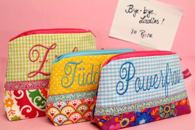 Seit Anfang der Woche ist der Shop also wieder ordnungsgemäß geöffnet, viele neue bunte Schminktäschchen habe ich bereits genäht, mit Mädchenkram, Weltenbummlerin, Zicke, Schwesterherz, Tüddelkram und anderen Wörtern bestickt und ins Regal gestellt und noch mehr Täschchen liegen schon zugeschnitten neben der Maschine und kommen demnächst peu á peu in den Shop!