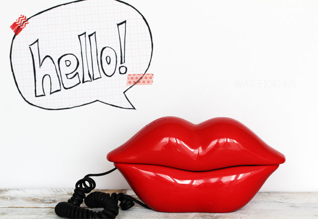 Lange Rede, kurzer Sinn: tadaaa – mein heißgeliebtes Lippentelefon. Es hat schon 18 Jahre auf dem Buckel. Gekauft habe ich es in den USA, wo ich damals ein Jahr lang lebte. Danach zog es mit mir nach Köln in meine erste Wohnung und wurde vorher von meinem Papa umgerüstet, damit ich damit auch in Deutschland telefonieren konnte. Fast zwei Jahre habe ich stundenlang an diesen Lippen gehangen, wenn ich mit meinen Freundinnen quatschte. Irgendwann zog dann ein etwas handlicheres Telefon, ohne Kabel und Schnur, ein und seitdem wandert das Lippentelefon zwischen diesem einen Raum im Keller und den Kinderzimmern hin und her. Manchmal steht es auch zur Deko im Wohnzimmer. Auf jeden Fall wird es nie nie nie weggeschmissen. Ich hänge einfach daran.