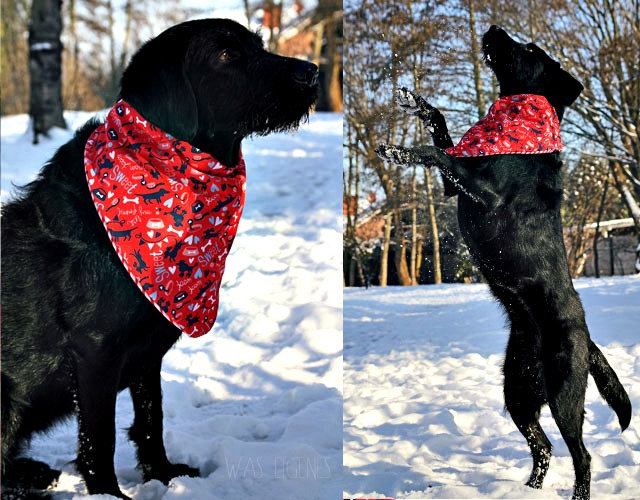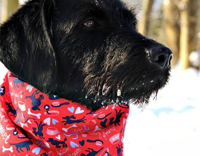 Das Halstuch ist total süß und passt prima zum schwarzen Fell. Ich konnte mit dem Stoff auch erstmal nix anfangen, aber das Designbeispiel von Frau Liebstes hat mich dann doch überzeugt :-)