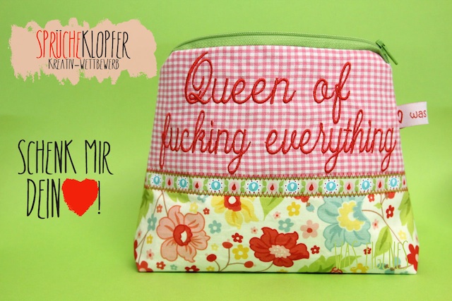 Also habe ich mich entschieden, eines meiner Täschchen ins Rennen zu schicken- Queen of fucking everything. Sollte Euch das Täschchen, oder besser der Spruch gefallen, dann würde ich mich freuen, wenn Ihr mir Euer Herz [klick] schenken würdet. Der Wettbewerb “Sprücheklopfer” läuft bis zum 15. April 2013. Der Artikel mit den meisten Herzen gewinnt und der Hauptgewinn ein Wochenende für zwei Personen in Amsterdam… hach, der würde mir extrem gut gefallen.