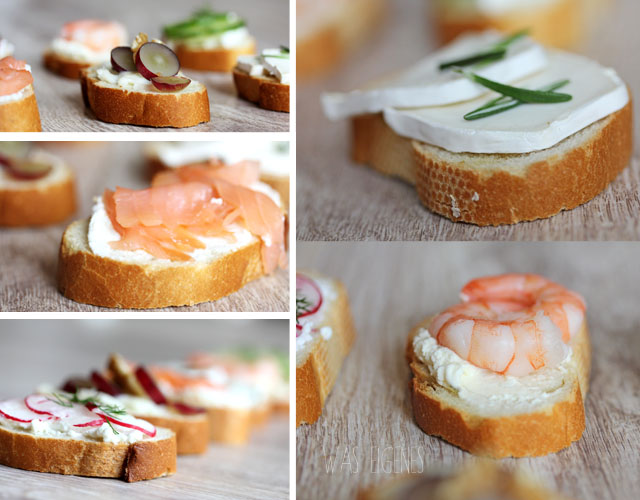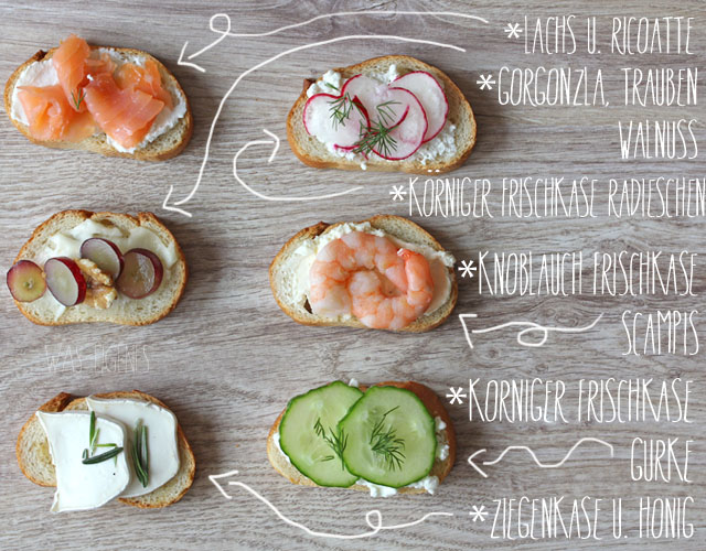Das war alles drauf: Ricoatte & Lachs, Gorgonzola, Trauben und Walnüsse, körniger Frischkäse & Radieschen, Ziegenkäse, Honig & Rosmarin, Knoblauch-Frischkäse & Scampis und körniger Frischkäse, Salatgurke & Dill.