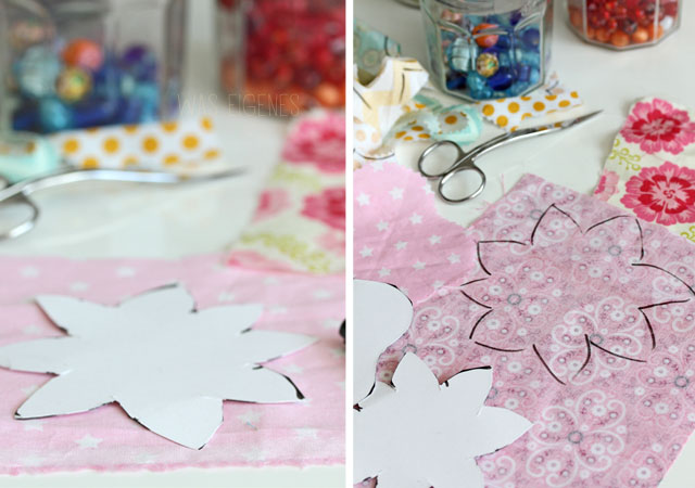 Auf Fotokarton habe ich ein paar Blumen in unterschiedlichen Größen aufgemalt und ausgeschnitten. Die Schablonen habe ich dann auf verschiedenen Stoffen übertragen und wieder ausgeschnitten. Einige mit der normalen Schere, einige mit der Zackenschere.