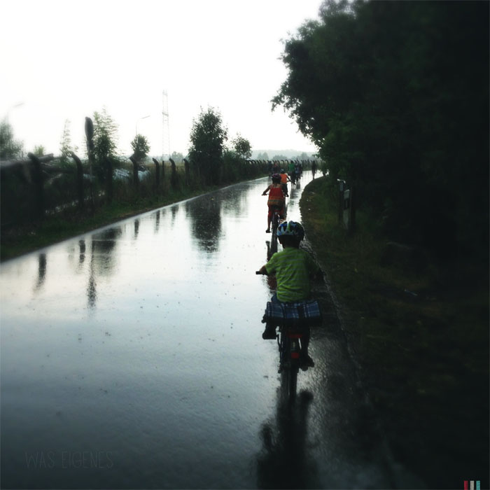 Dann kam eine unerwünschte Abkühlung von oben. Strömender Regen, quietschende Füße in Gummischuhen, triefendnasse Klamotten kleben am Körper, glatte Strassen.