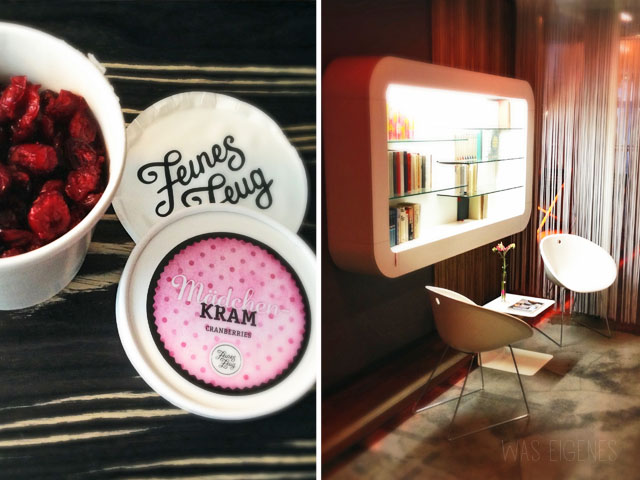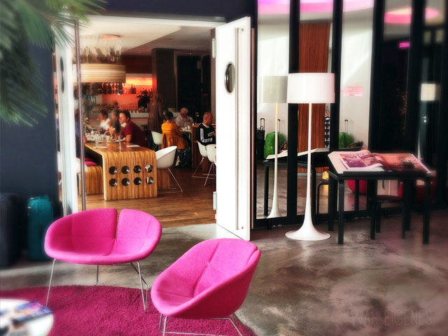 Das Restaurant ist klein, was ich sehr mag. Diese riesigen Hotelrestaurants erinnern einen doch oft an Kantinen. Auch dort ist das Servicepersonal sehr lässig, entspannt und freundlich. Keine weißen Blüschen, schlichte Shirts und Schürzen. Das Frühstück war köstlich und umfangreich, der Kaffee wurde pronto an den Tisch gebracht, Spezialitäten, wie Latte Macchiato oder Capucchino kann sich der Gast selbst an der Nespressomaschine ziehen. Auf der Terrasse, gleich vor dem Restaurant gibt es gemütliche Loungesessel und -sofas, wo man perfekt Pläne für den Tag schmieden oder den Abend ausklingen lassen kann. Wenn das Wetter doch nur ein klitzekleines bißchen besser gewesen wäre. Hamburg, eben… tsss! ;-)