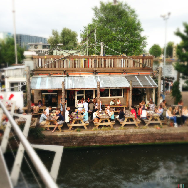 Hannekes Boom ist ein Restaurant mit Biergarten oder besser: eine olle Bretterbude mit gemütlichem Flair, ganz entspannter Atmosphäre und einem wunderschönen Blick auf Amsterdam und die untergehende Sonne. Da wir ja schon gegessen hatten, haben wir nur etwas getrunken und die vollen Teller mit Burgern, Salaten und Pommes an uns vorbei ziehen lassen.