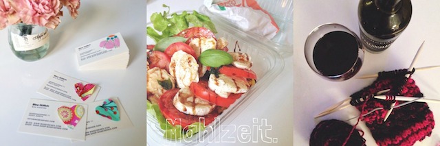 Visitenkarten mit aufgenähtem Stoffherz. // Manchmal muss es schnell gehen: Mittagessen vom freundlichen Lieferservice. // Gemütlicher Abend mit Strickzeug und einem Glas Rotwein.